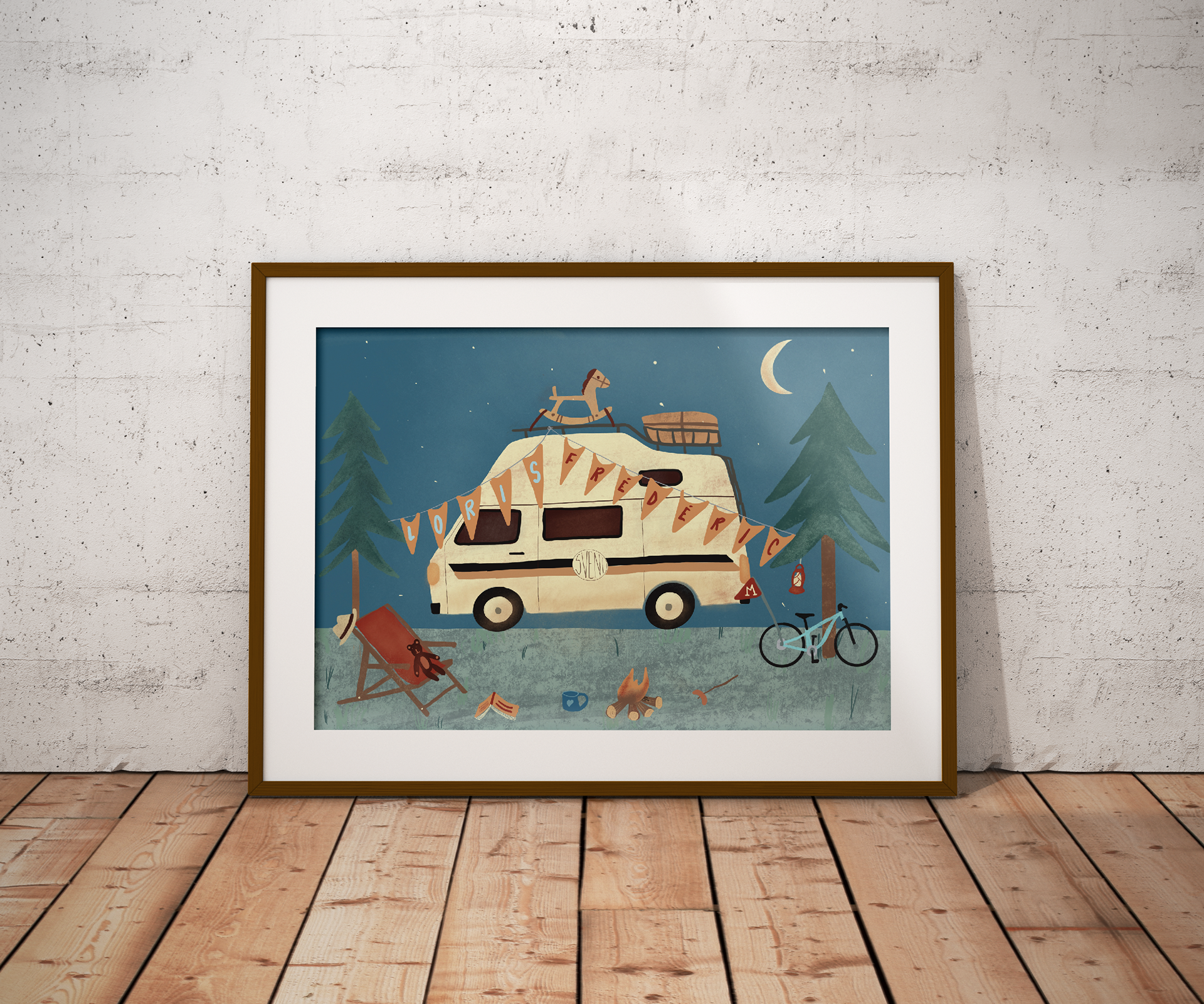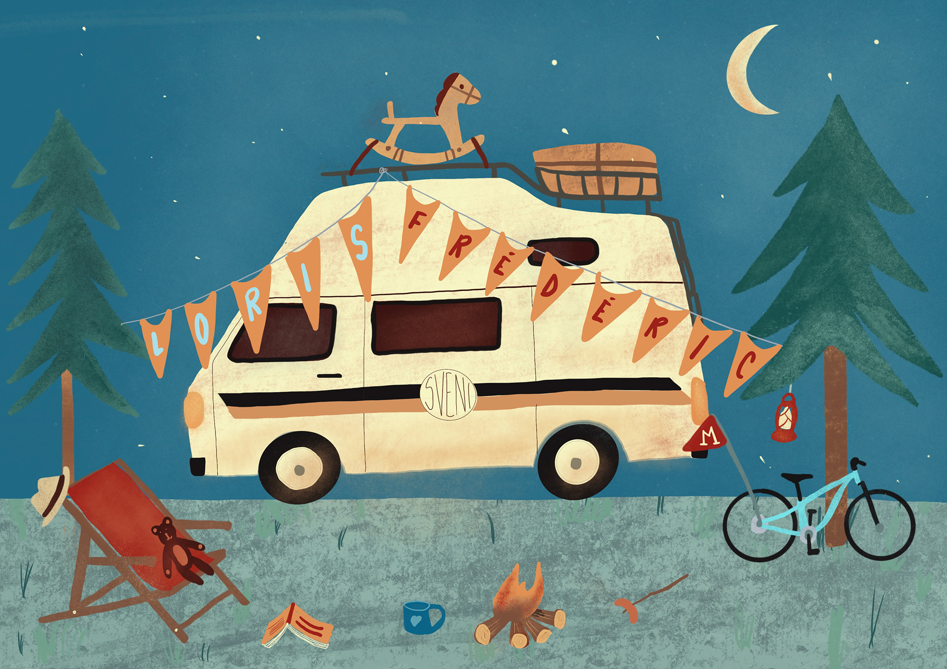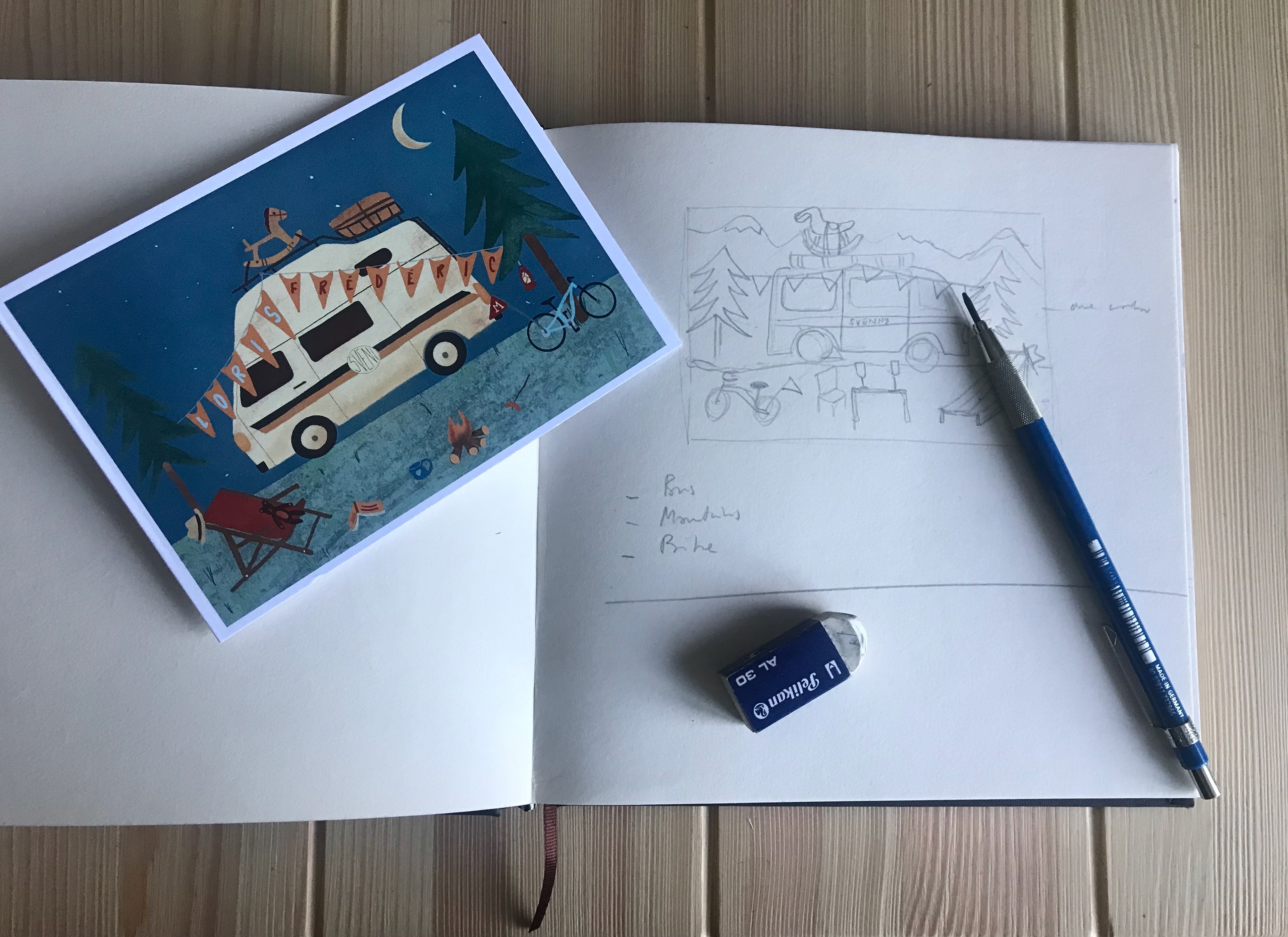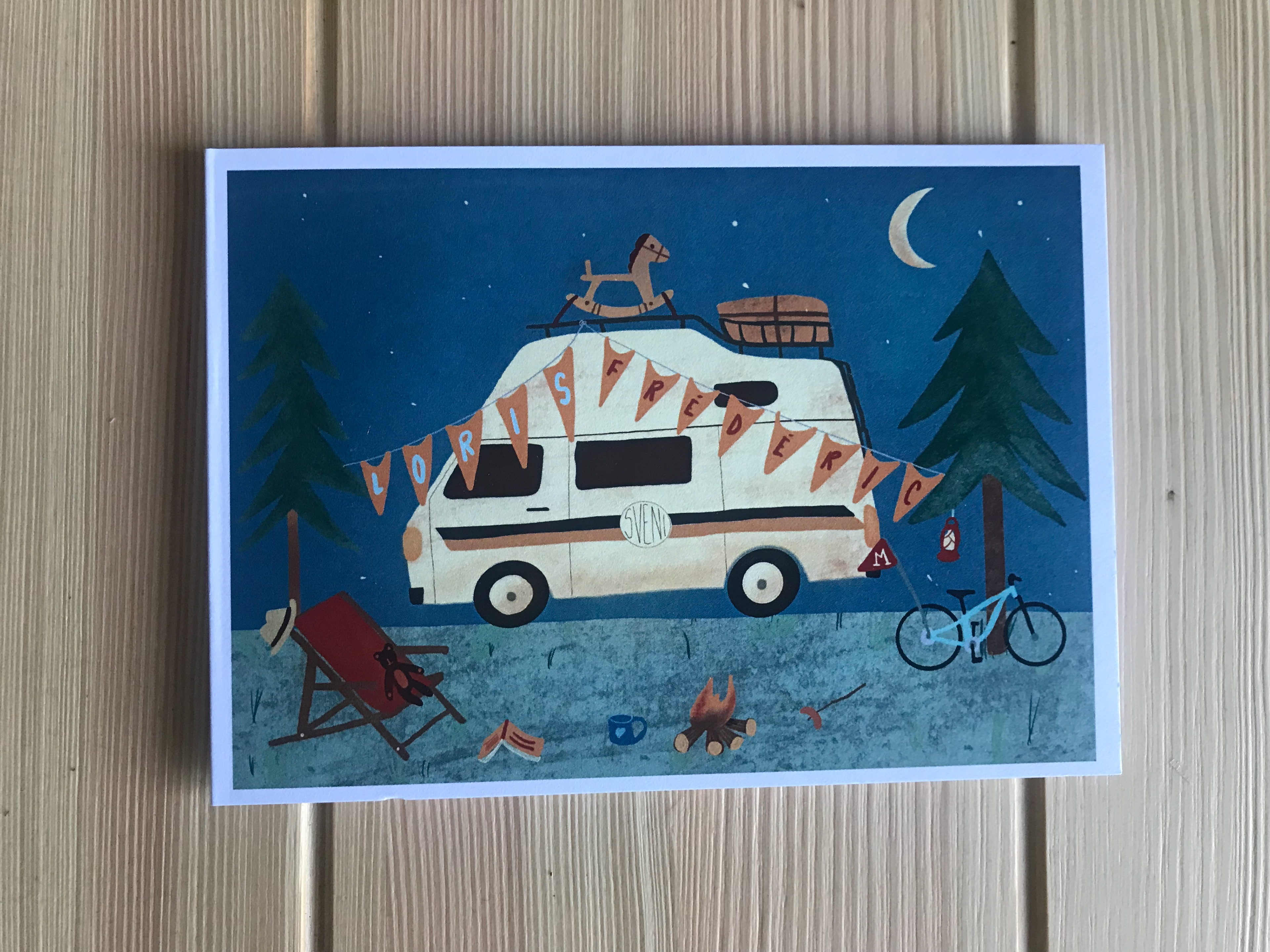 This is a birth announcement card I made for some friends. They wanted something personalised that represented their passions. I decided to focus on their old timer VW Bus they call "Sveni" and add some details of their lives around the campsite that was left suddenly because of the birth of their second son.
