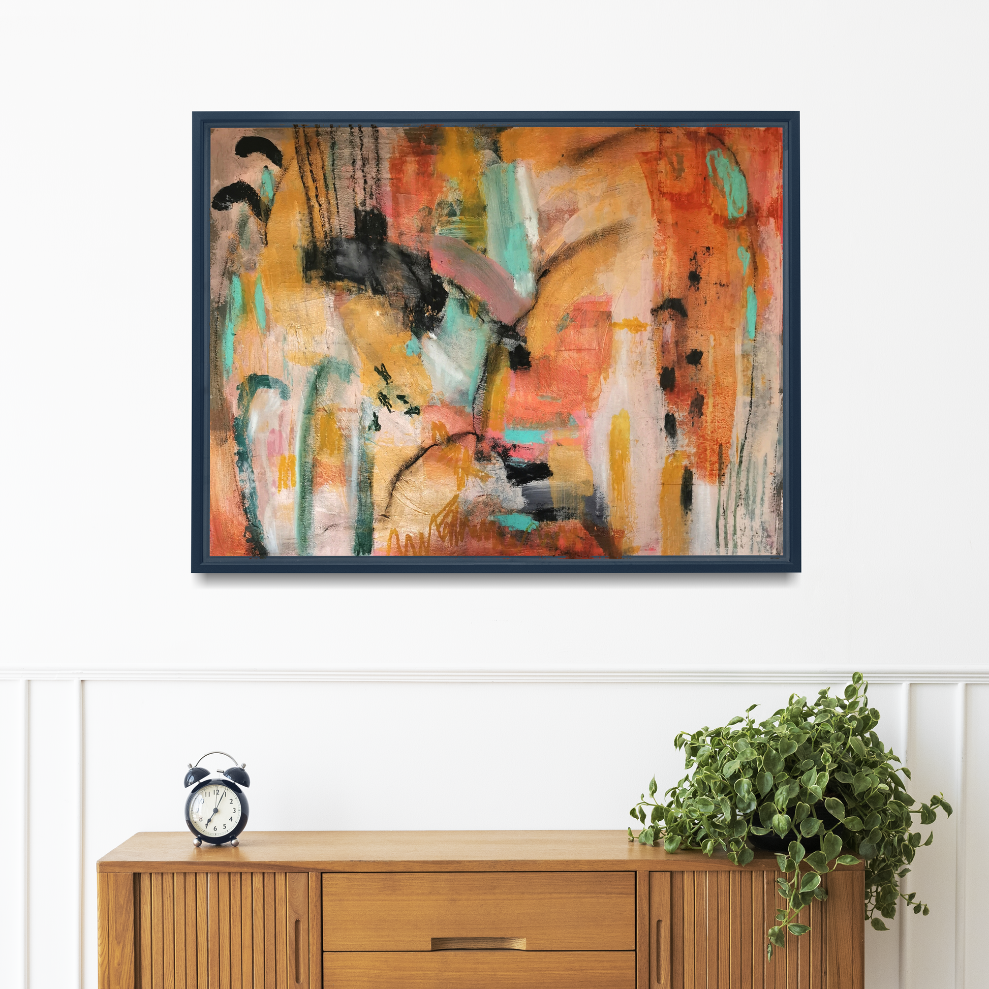 "Feel" is a contemporary artwork that features a vibrant interplay of warm and earthy tones, including burnt orange, golden yellow, soft pink, and hints of turquoise. Bold black accents and expressive brushstrokes create dynamic contrasts, while layered textures and soft gradients evoke depth and movement.