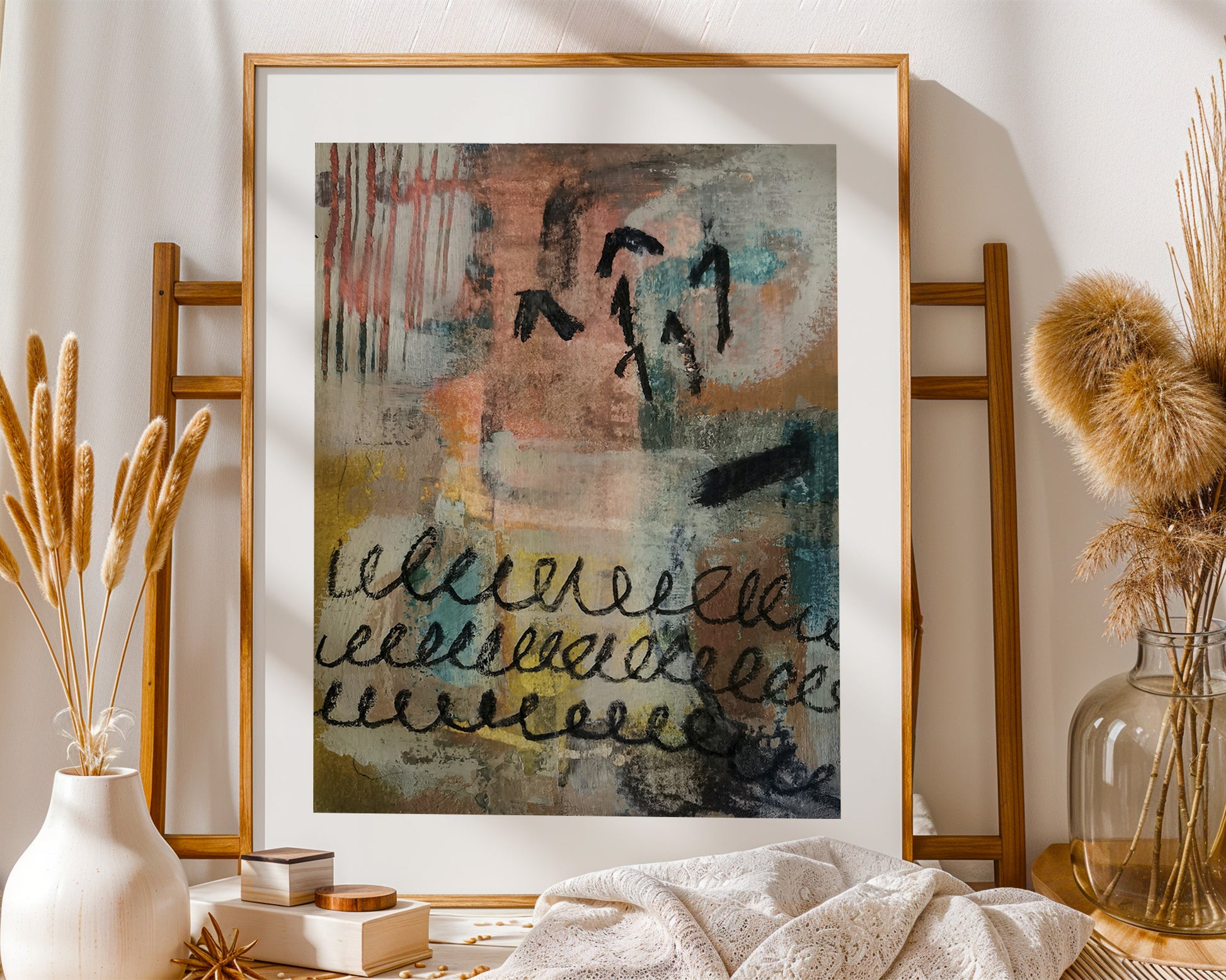 Museum-quality poster of my original abstract painting "Leave your mark", a contemporary artwork painting has a layered, warm, textured color palette on heavy weight premium matte paper*, features a smooth, uncoated finish that feels luxuriously soft to the touch.