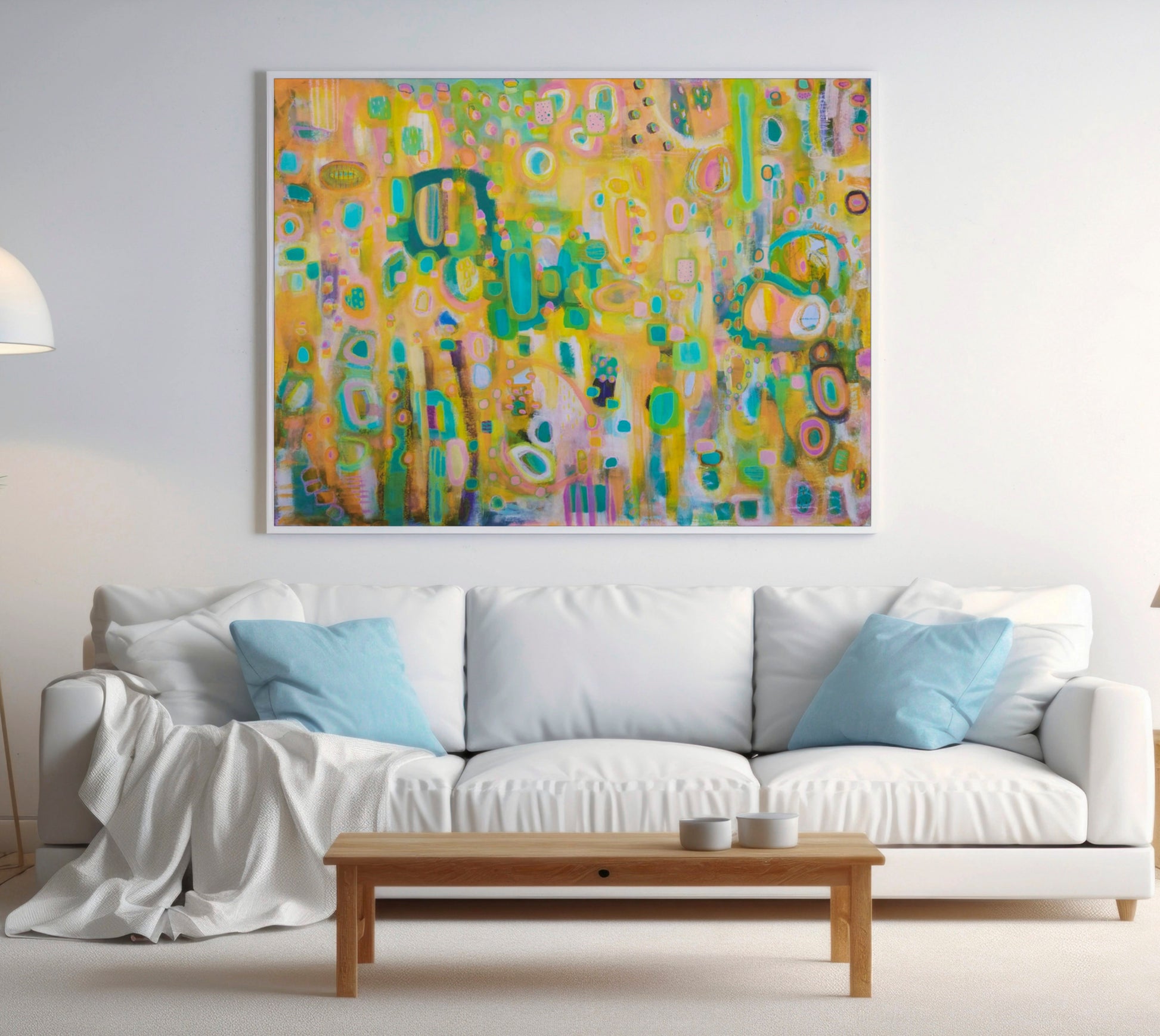 This large colorful painting is inspired by summer season, I wanted to paint something that brings joy and happy vibes. I used acrylic paint and oil stick on cotton canvas.